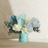 A poetic blend of light blue hydrangeas, Athena roses, delphiniums, and painted leaves, kissed by winter eucalyptus.