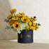This arrangement contains, Eucalyptus, Sunflower 10, Hydrangea white 2, Spray rose yellow 5, Pistachia set in a medium box.